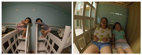 这可不是在游乐场,这是宿舍,上面是床铺,下面是衣柜和沙发,一看这POSE就知道很舒畅很新奇的,有木有?