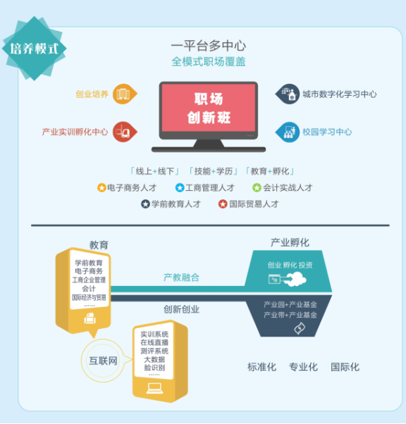 职场创新班为职业核心能力人才培养特色项目,实行全日制在校管理。公司根据每个专业的产业方向建立了校企合作、实训产业带、创业产业园等,深化教育深度、促进产教融合,打造“现代职场培养生态圈”,专业培养职场创业人才。