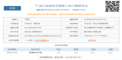 4.选择支付方式(支付宝,绑定的储蓄卡或信用卡),完成付款。完成付款后将生成“浙江省政府非税收入电子缴款凭证”。